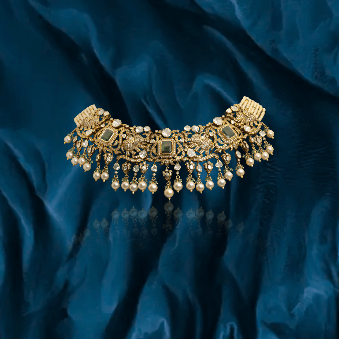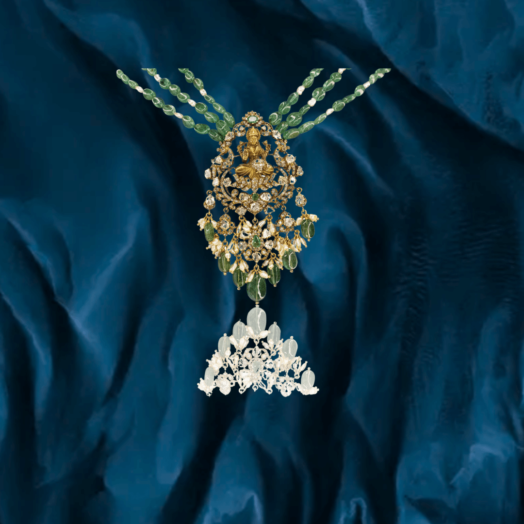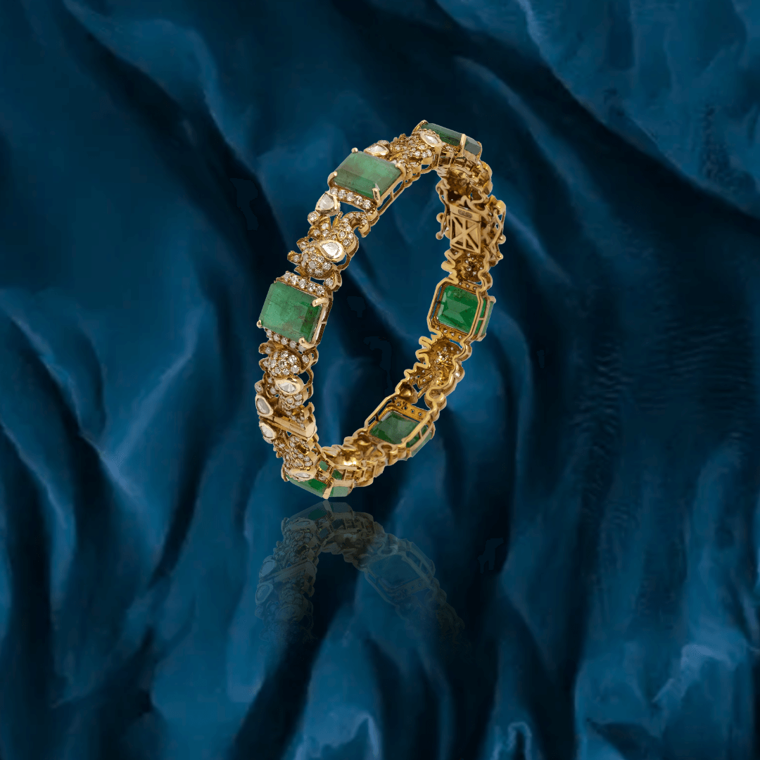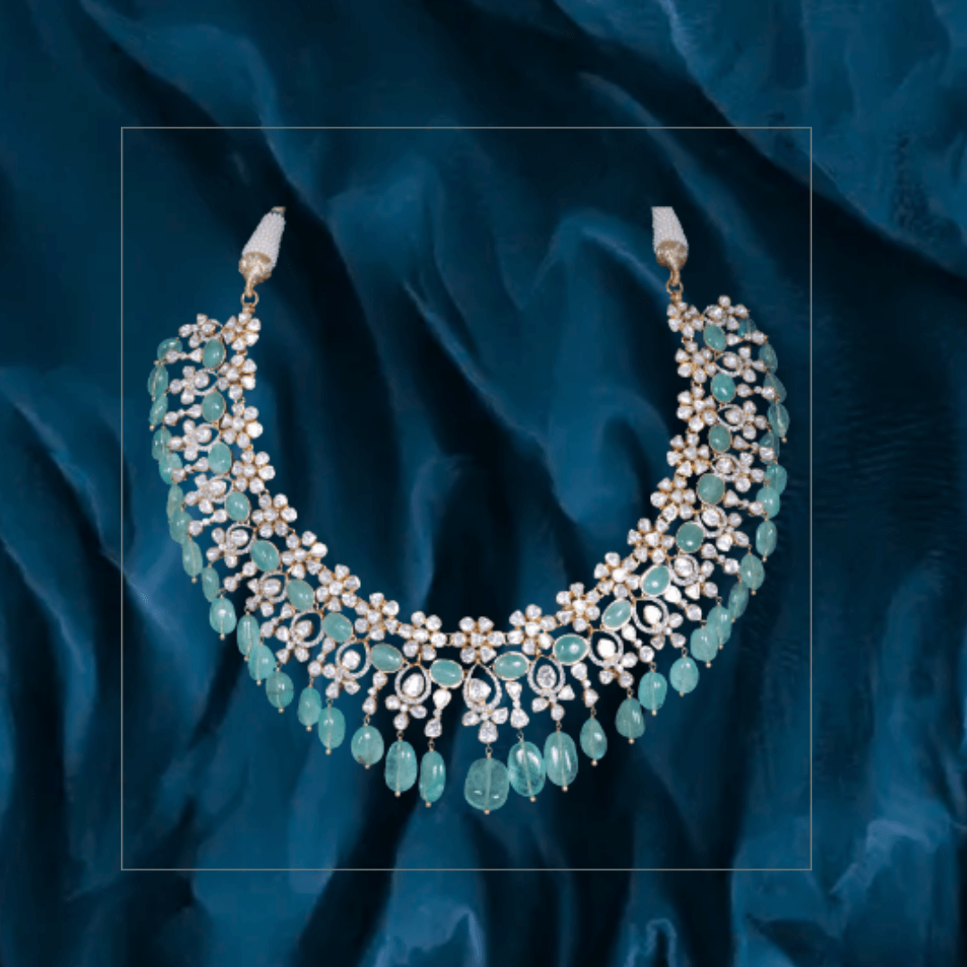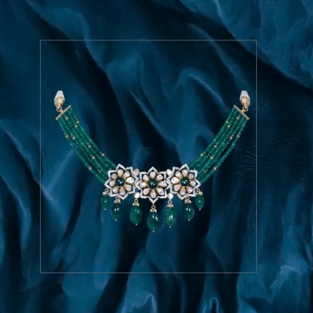 Pure handcrafted jewelry in 18K yellow gold. Uncut diamonds and semi precious colored gemstones set artistically to design motifs that are traditional and timeless.