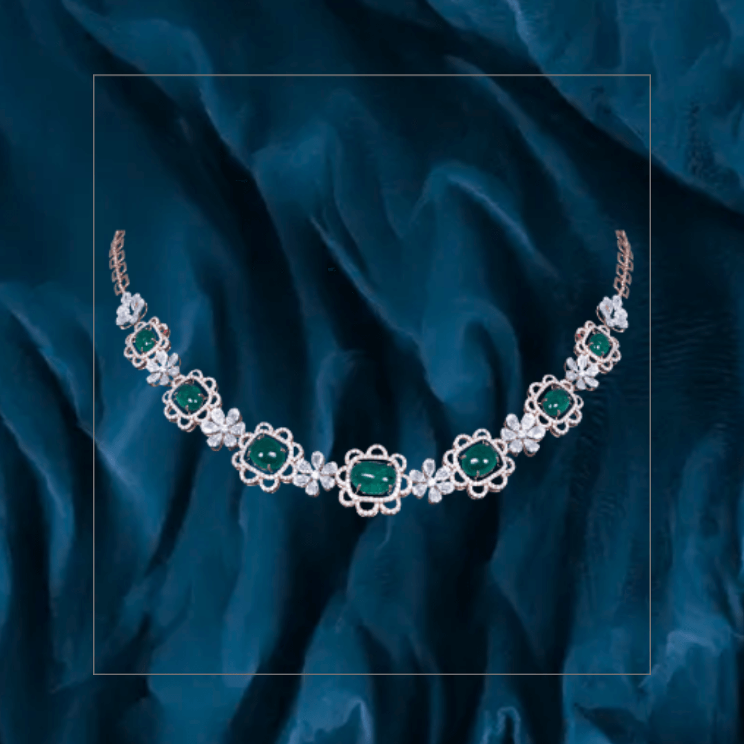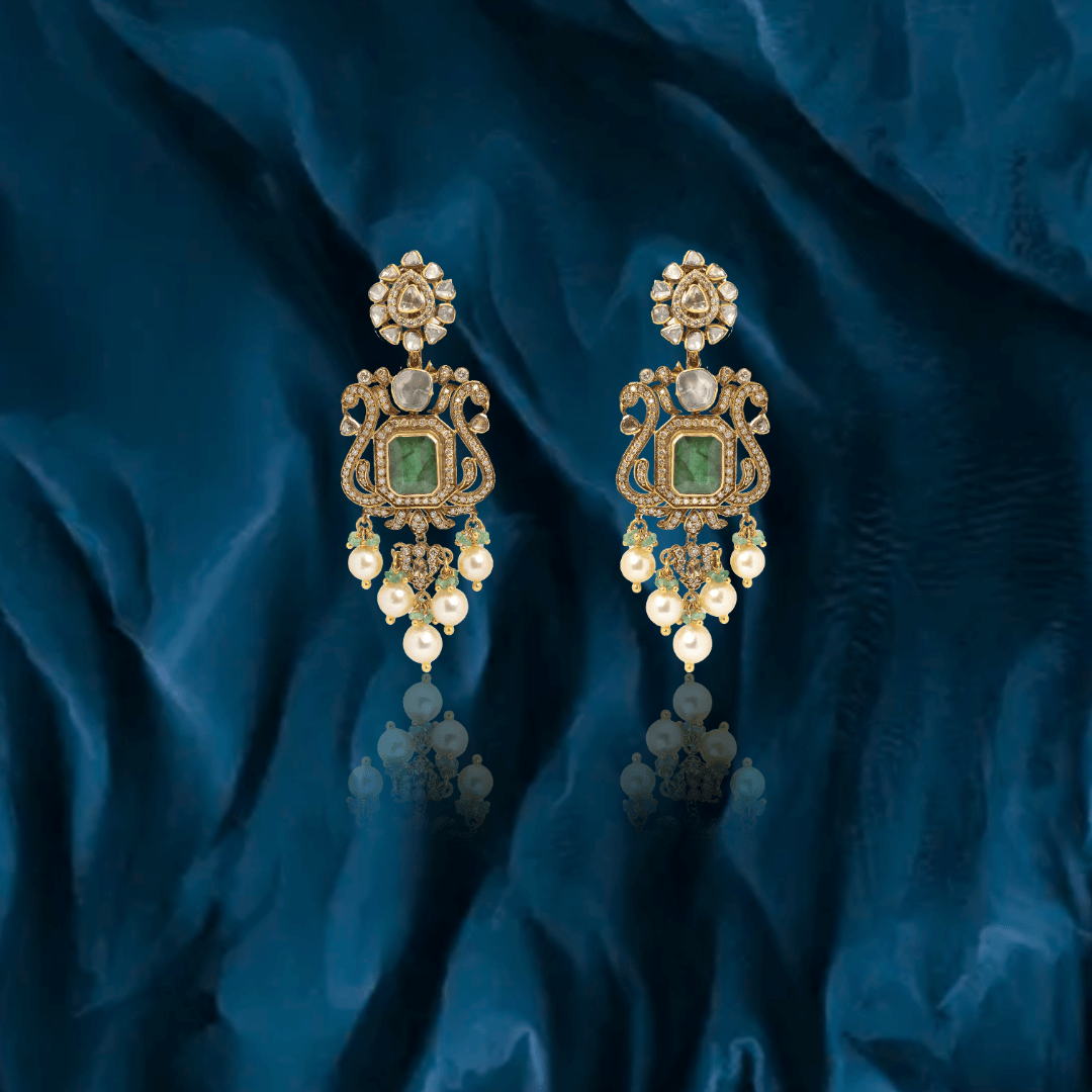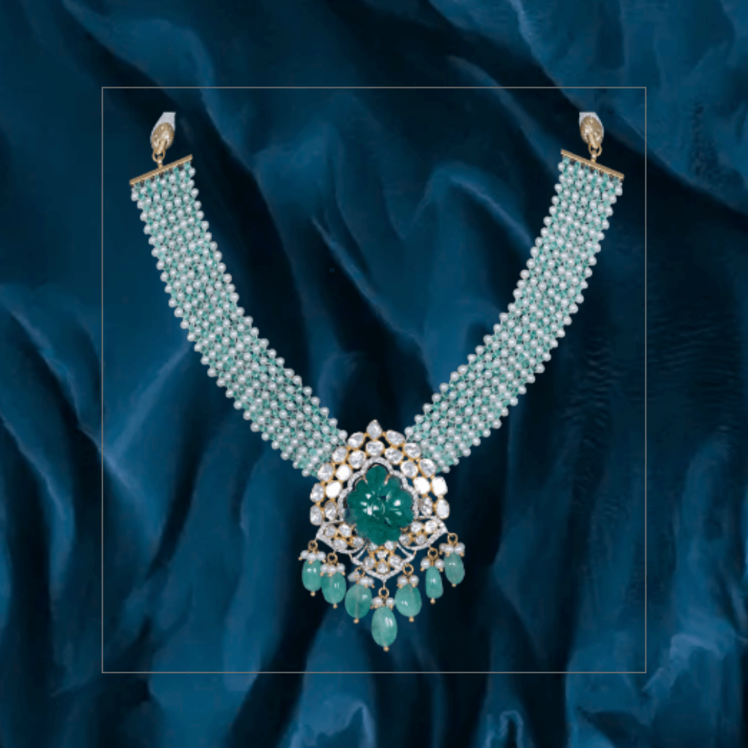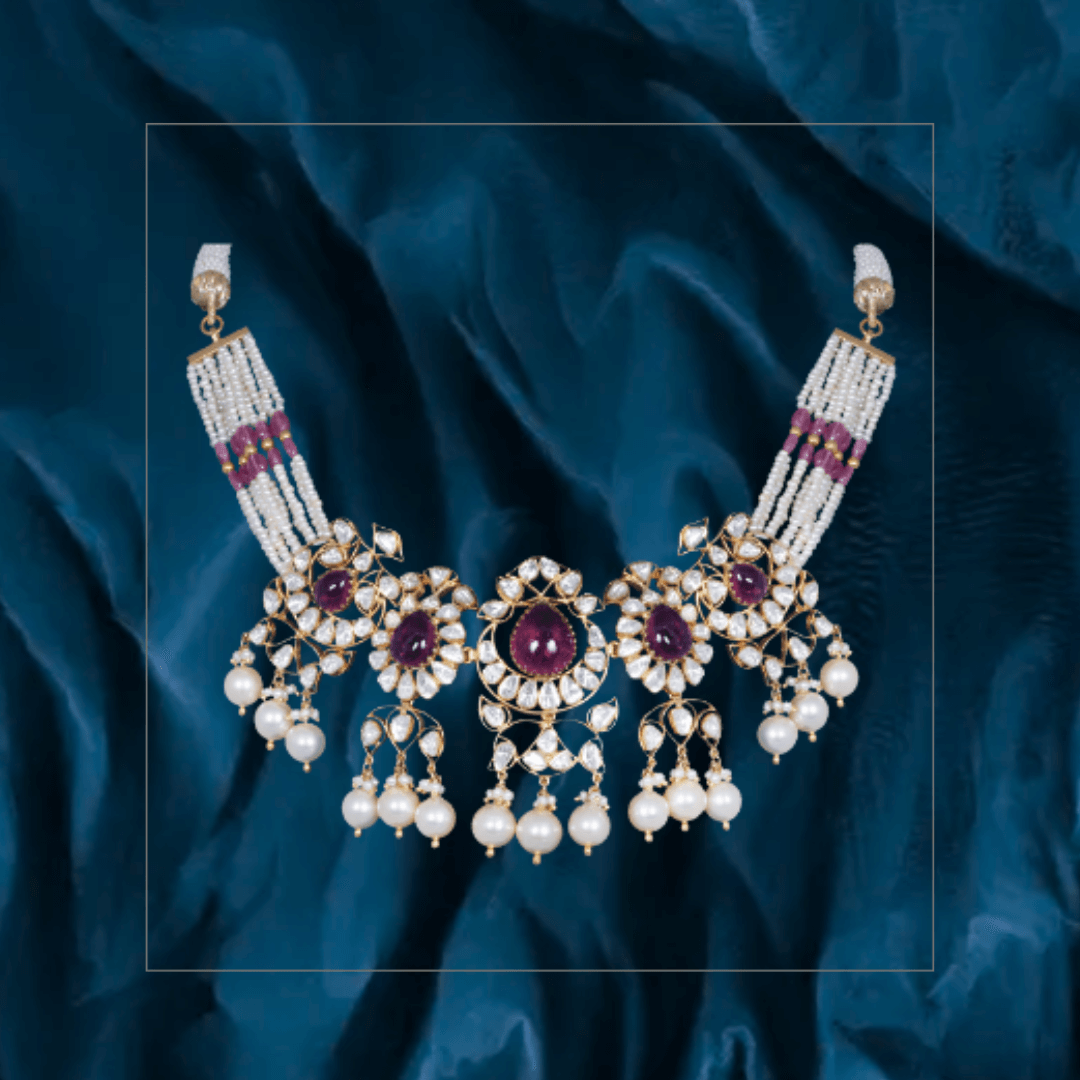 Pure handcrafted jewelry in 18K yellow gold. Uncut diamonds and semi precious colored gemstones set artistically to design motifs that are traditional and timeless.