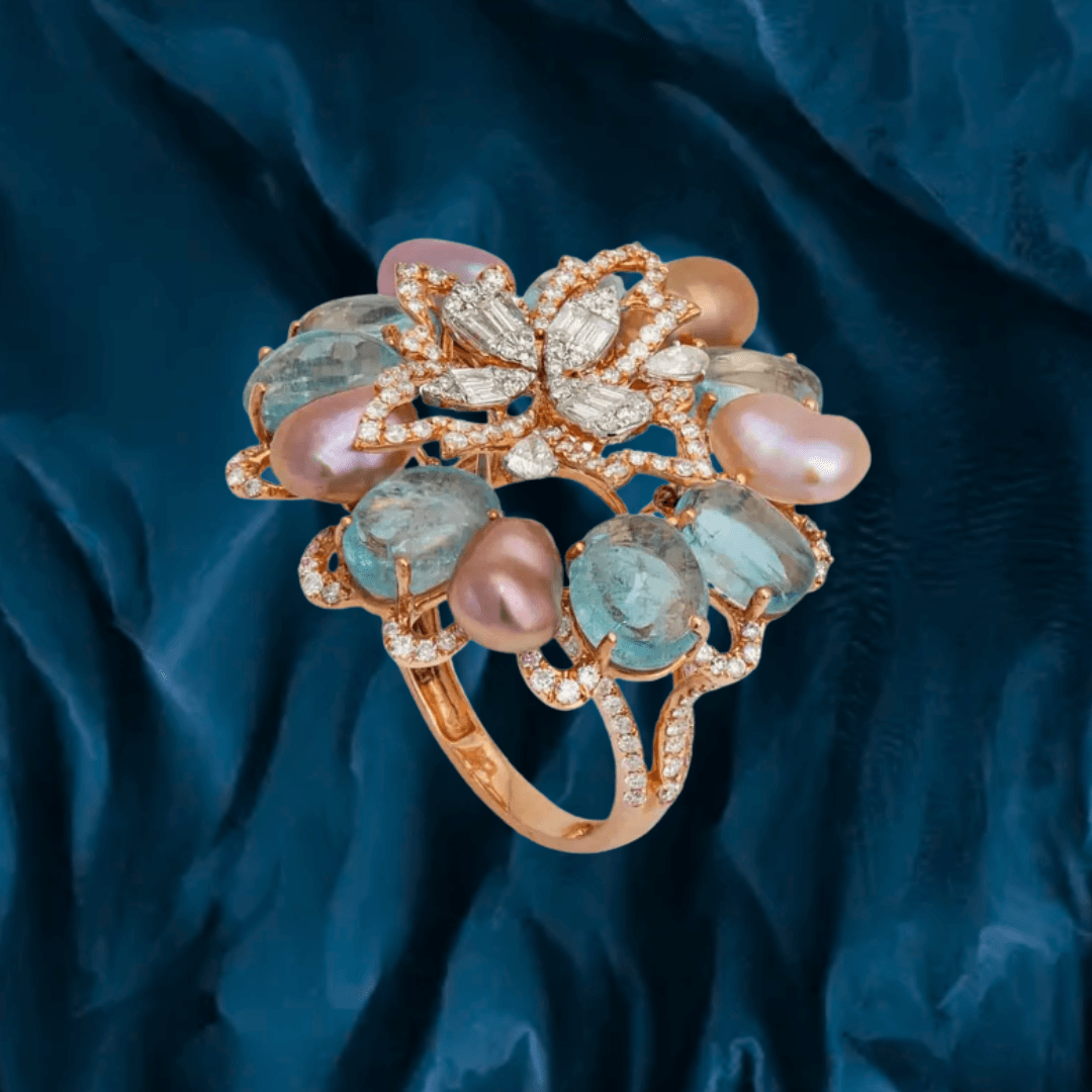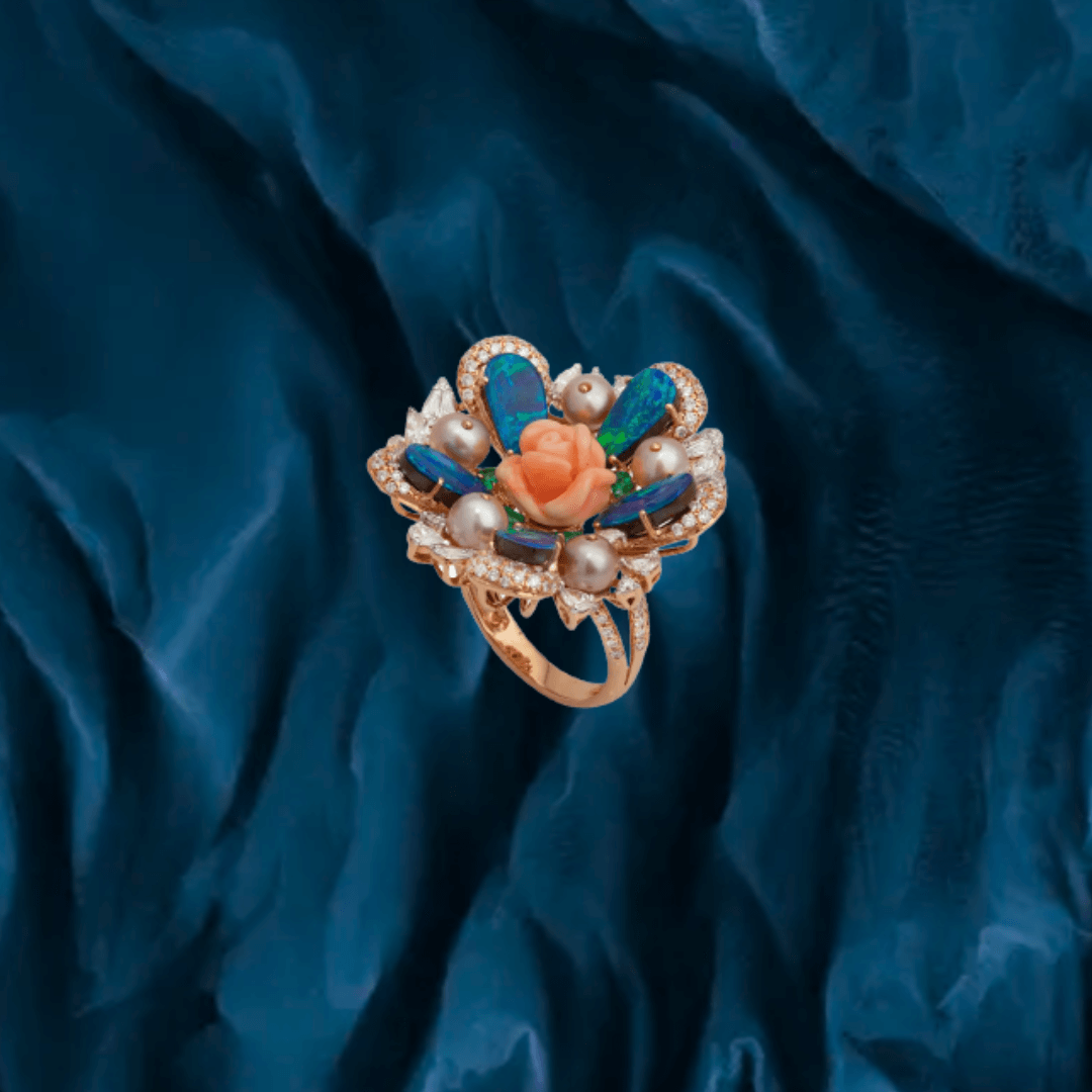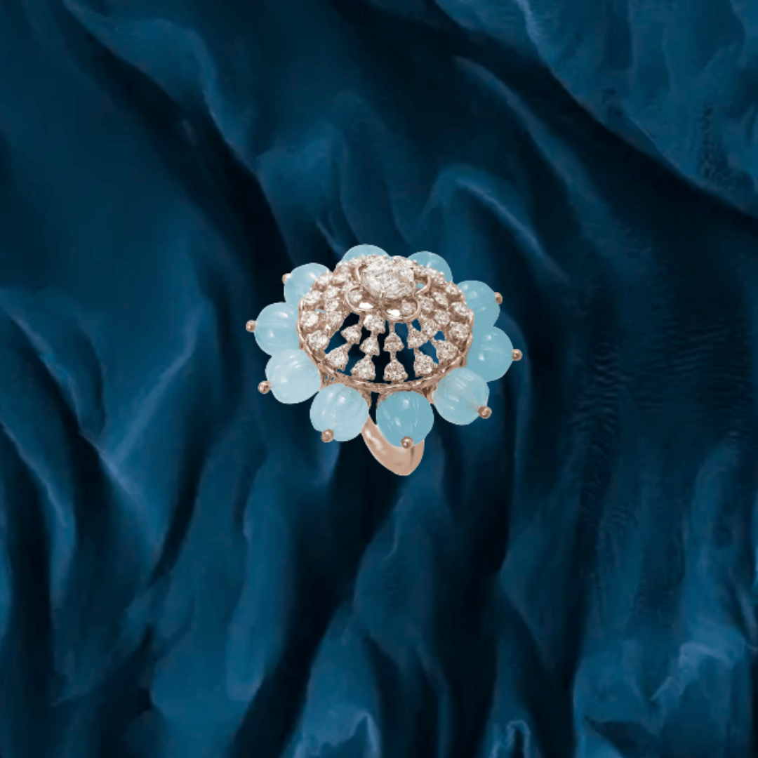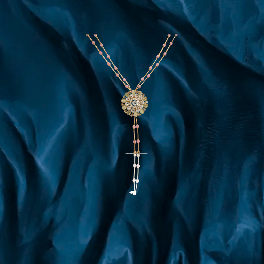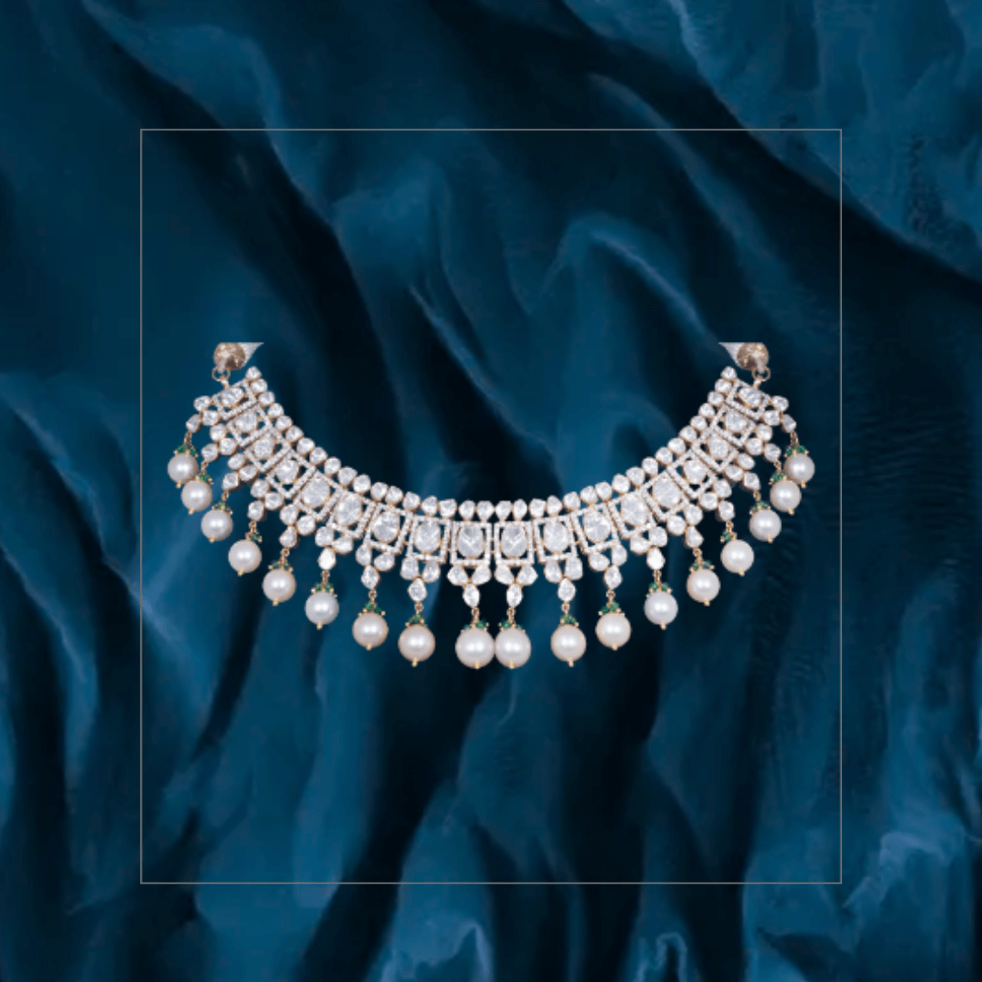 Pure handcrafted jewelry in 18K yellow gold. Uncut diamonds and semi precious colored gemstones set artistically to design motifs that are traditional and timeless.